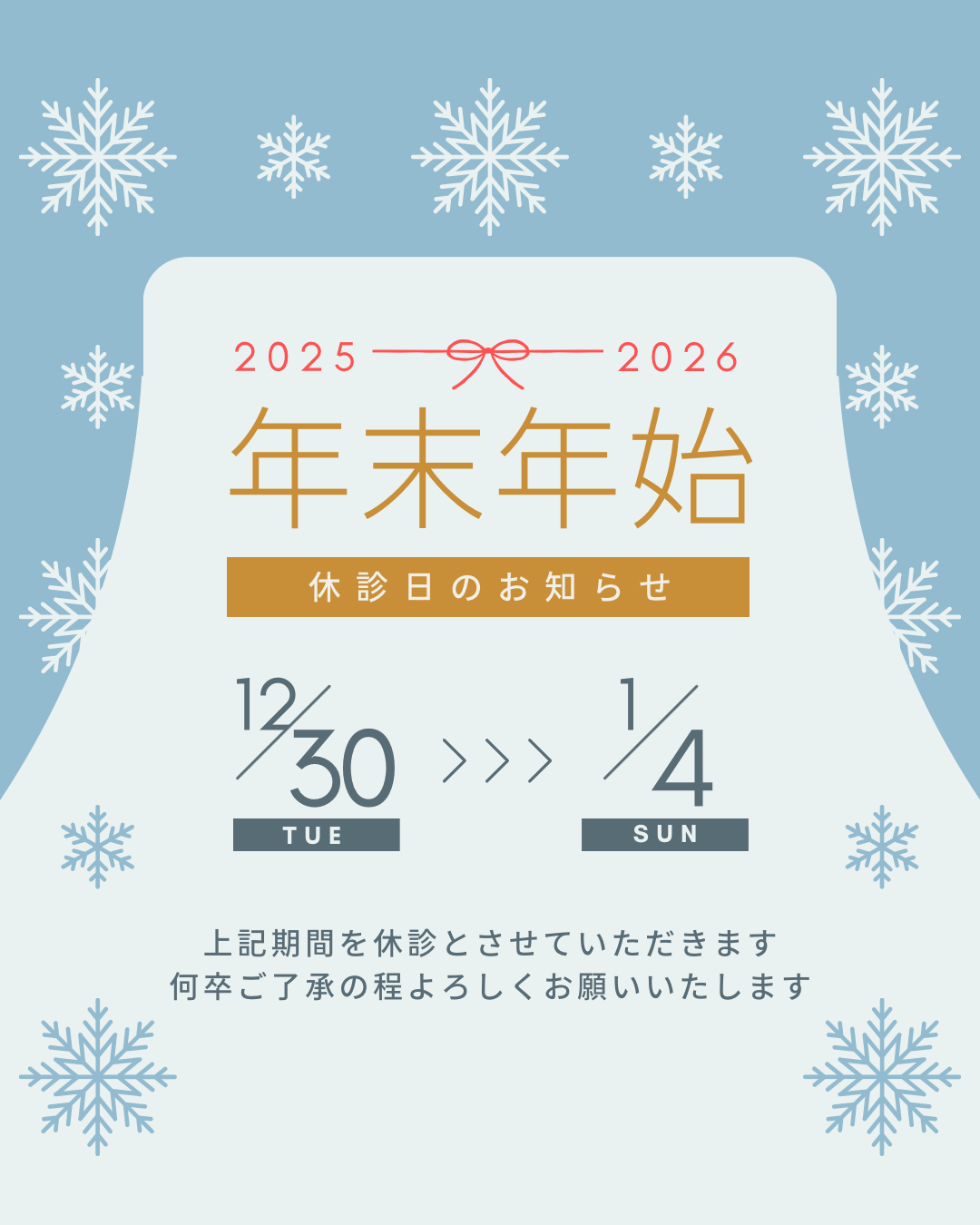 年内の診療は12/29(月)12時まで、年始は1/5(月)から通常診療となります。